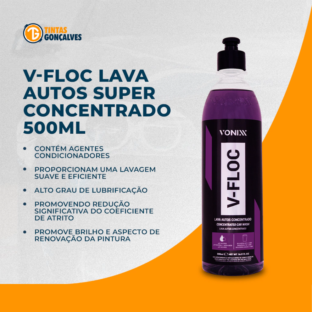 V-Floc é um lava autos de alta performance e de pH neutro. Sua fórmula contém agentes condicionadores e tensoativos especiais que proporcionam uma lavagem suave e eficiente. V-Floc tem alto grau de lubrificação, promovendo redução significativa do coeficiente de atrito, proporcionando um melhor deslize da luva microfibra e reduzindo de forma efetiva as chances de microrriscos na pintura. V-Floc também promove brilho e aspecto de renovação da pintura.
